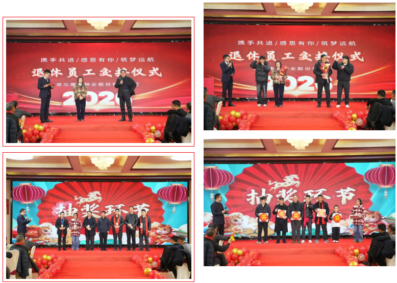 晚宴现场温情与惊喜交织,多轮抽奖环节接连上演,从三等奖到特等奖,丰厚奖品为员工们送上满满的新年祝福。更具温度的退休员工交接仪式温情上演,老员工将奋斗的接力棒郑重传递给青年一代,这一幕不仅见证了康农种业“薪火相传”的精神传承,更让在场所有人感受到公司大家庭的温暖与责任延续。总经理彭绪冰深情演唱《我和我的祖国》,抒发了康农人深耕大地、心怀家国的赤诚情怀。