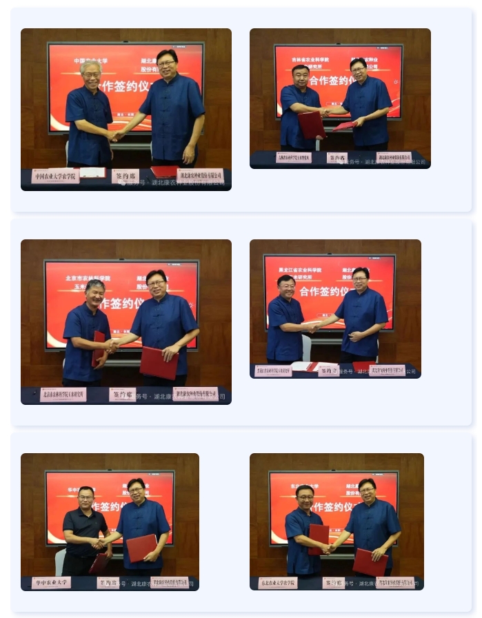 会议期间,康农种业分别与中国农业大学农学院、北京市农林科学院玉米研究所、安徽农业大学、东北农业大学农学院、黑龙江省农业科学院玉米研究所、吉林省农业科学院玉米研究所等十家科研院所签署战略合作协议,此次战略合作突破地域限制,联合东华北、黄淮海、西南区域十家科研院所旨在将市场面向全国,整合种质资源、育种技术及市场转化优势,构建“基础研究—品种培育—示范推广-产业服务”一体化创新体系,实现“技术突破、产业链整合与政策赋能”的良性循环,共同导入科研与产业优势,推动科企合作迈向纵深。未来,合作各方将围绕种质资源创新与新品种选育,针对高产优质、抗病抗逆等目标性状,利用基因编辑、分子标记辅助育种等前沿技术,开发适应多元化需求的玉米新品种,重点突破高蛋白、低毒素饲用玉米等附加值品种展开攻关。